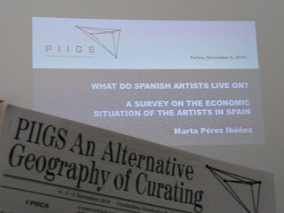 Un avance del Estudio sobre la Situación Económica de los/las Artistas en España se ha presentado el pasado sábado 5 de Noviembre en la Fundación Sandretto Re Rebaudengo de Turín. Dentro del programa de debates planteado en el marco de PIIGS, An Alternative Geography of Curating, la profesora de la Universidad Nebrija Marta Pérez Ibáñez fue invitada a presentar algunos detalles de este amplio proyecto de investigación interuniversitario, del que es coautora junto al profesor Isidro López-Aparicio de la Universidad de Granada. El programa PIIGS, que ha planteado cinco propuestas curatoriales sobre la actual situación del sector de la creación en los cinco países europeos denominados bajo estas siglas, Portugal, Italia, Irlanda, España y Grecia, puso el énfasis en la necesidad de conocer tanto las dificultades por las que atraviesa el colectivo de los creadores en estos países, así como el nuevo perfil de artista que se abre camino en un sector que está dejando notar una evolución constante y profunda. Por ello, el avance de los resultados que el Estudio sobre la Situación Económica de los/las Artistas en España empieza a arrojar resultó muy esclarecedor, ya que posibilitó no sólo un debate abierto con artistas y comisarios internacionales, sino una interesante comparación con la situación de los artistas en otros países europeos y con las dificultades y oportunidades que están encontrando en los últimos años en el desempeño de sus carreras.