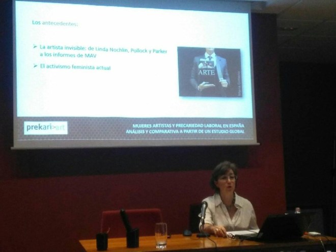 El grupo de investigación PrekariArt de la Universidad del País Vasco UPV-EHU, dirigido por la profesora Kontxa Elorza, ha celebrado los días 7 y 8 de Mayo un seminario internacional que bajo el título de “¿Es el arte un trabajo?” ha reunido a artistas, profesionales y académicos de diferentes países. La primera jornada, celebrada en la Facultad de Bellas Artes de la UPV-EHU, tuvo como eje central “Mujeres y trabajo en arte”, y arrancó con una charla de la artista Núria Güell que habló sobre su trayectoria, su proceso creativo y sobre algunas acciones realizadas en los últimos años en torno a diversas problemáticas de la mujer en la sociedad. A continuación, Marta Pérez Ibáñez desarrolló su conferencia sobre “Mujeres artistas y precariedad laboral en España. Análisis y comparativa a partir de un estudio global” en la que, tras contextualizar la situación de invisibilidad y desigualdad de las artistas españolas en nuestro sistema, y partiendo de los datos aportados en el estudio “La actividad económica de los/las artistas en España” publicado en 2017, desgranó los datos específicos que recoge dicho estudio sobre las mujeres participantes en el mismo, el 52% de los artistas analizados. Se trató de la primera presentación en público de los resultados de esta segmentación y del análisis de las mujeres artistas dentro de nuestro contexto, resultados que se publicarán próximamente en la revista de investigación “Arte, individuo y sociedad”.
